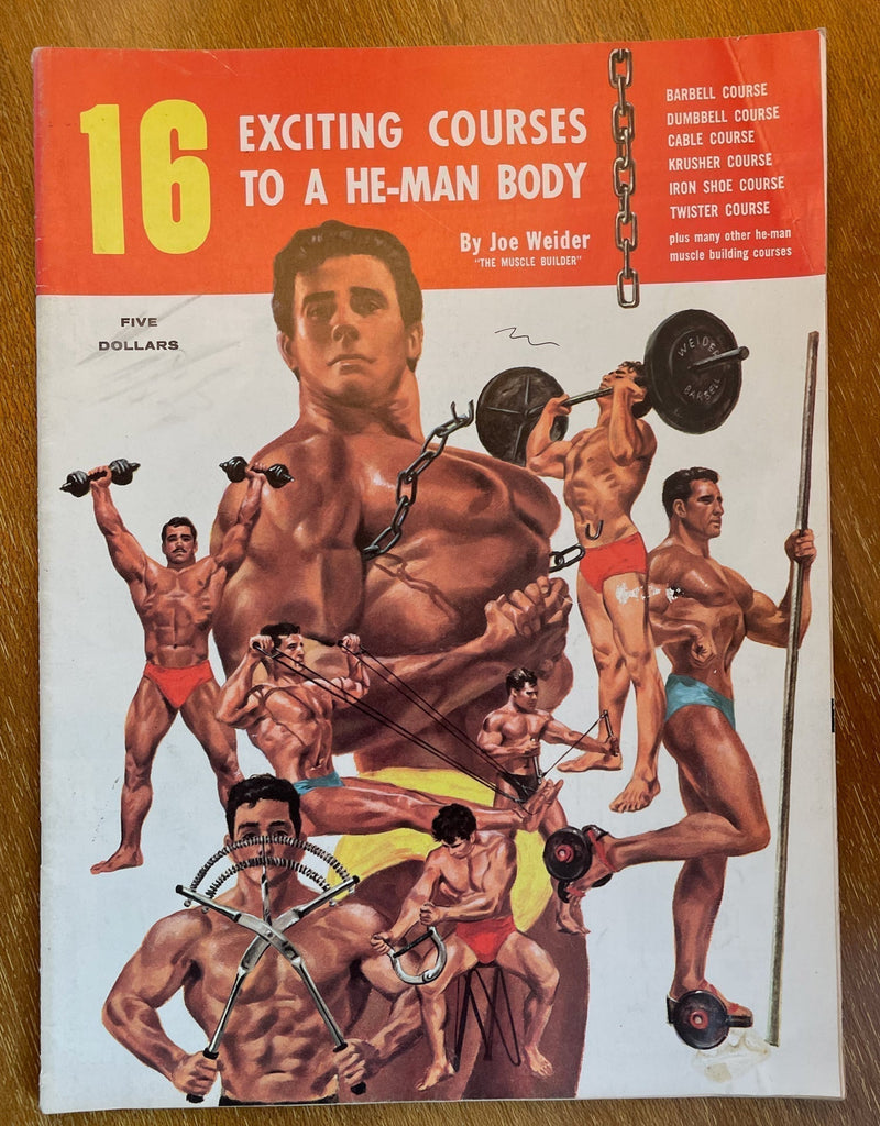 The dozen or so magazines and twenty photos were all in very good condition. But even so, they were consigned to the trash. Not an uncommon occurrence. What makes this little collection special is a piece of stationery stuck between the pages of Joe Weider’s “16 Exciting Courses to a He-Man Body.”