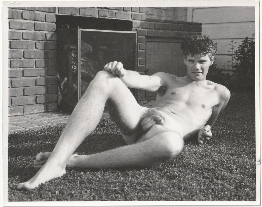 Vintage male nude photo. Lying on artificial turf before an outdoor fireplace, this handsome guy poses in the sunshine.